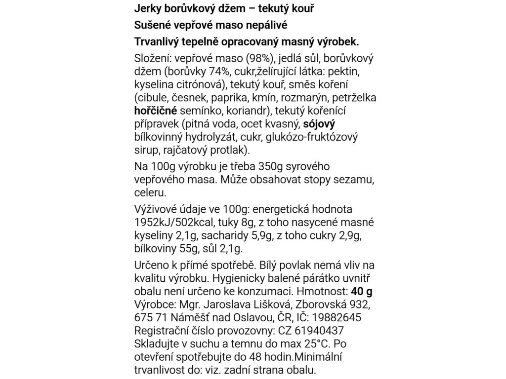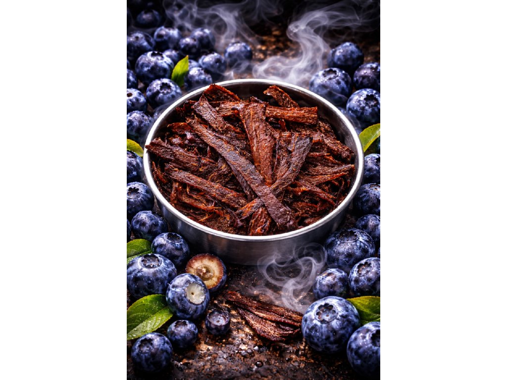 Maso je sušeno tak, aby si zachovalo svou šťavnatost a pevnou strukturu. Borůvkový džem dodává Jerky kulatost a jemnost, zatímco tekutý kouř přináší decentní, nevtíravé aroma grilu bez přehnané intenzity.