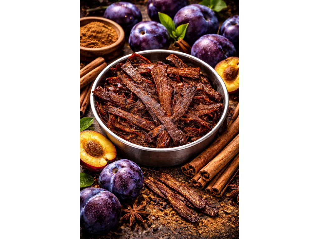 Tato speciální edice vznikla ve spolupráci s výrobcem džemů Mlsný Jelen, se kterým sdílíme stejný přístup ke kvalitě i regionálnímu původu surovin. Do marinády je použit jejich švestkový džem, který dodává masu přirozenou ovocnou sladkost a plnost chuti. V kombinaci s jemně hřejivou skořicí vzniká harmonický chuťový profil – nejprve se rozvine sladký tón vyzrálých švestek, následně nastoupí plná masová chuť a v závěru zůstane lehký kořeněný dozvuk.